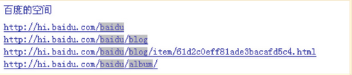 以百度空間為例,url結構中加入了用戶id信息,用戶在看到空間的url時,可以方便的判斷是誰的空間。url結構中還加入了blog、album等內容信息,用戶可以通過url判斷將要看到的內容是一篇博客,還是一個相冊。