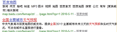 例子中的網頁,提供全國主要城市的天氣預報服務,第一個結果中,使用了百度地圖默認的title,用戶在搜索結果無法判斷這個網站提供的內容是什么,也就不會點擊這個結果,第二個結果中,title很明確的寫明了所提供的內容,用戶判斷起來比較容易,選擇這個結果的可能性比較大。