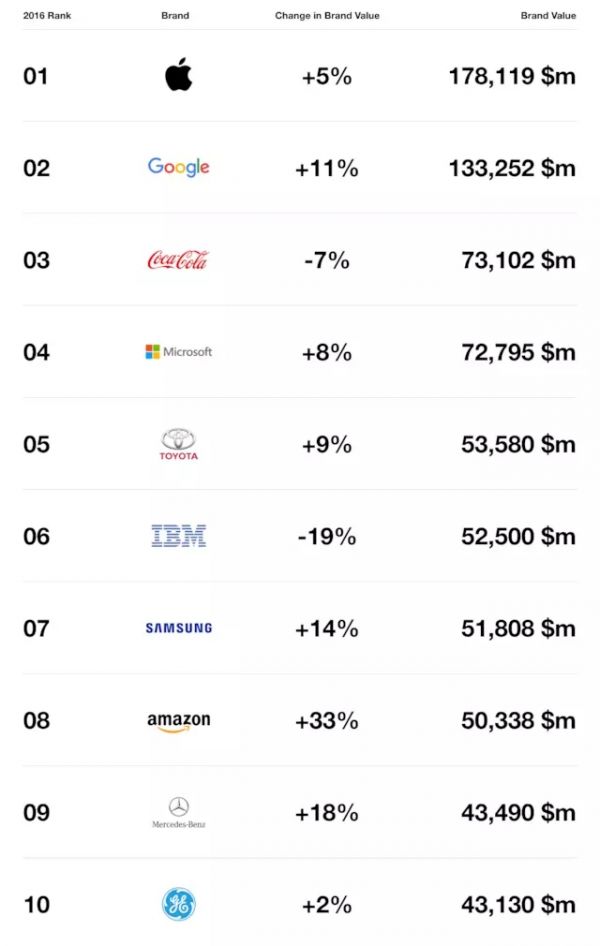 Top 10 依次為:蘋果、Google、可口可樂、微軟、豐田、IBM、三星、亞馬遜、奔馳、通用