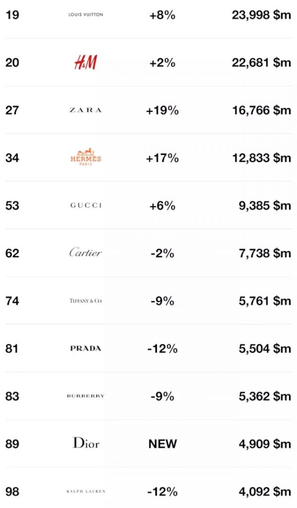 快時尚仍然表現極佳,Zara 和 H&M 的品牌價值都高于一眾奢侈品牌,而入榜的 9 個奢侈品牌有 5 個的品牌價值都在下滑。