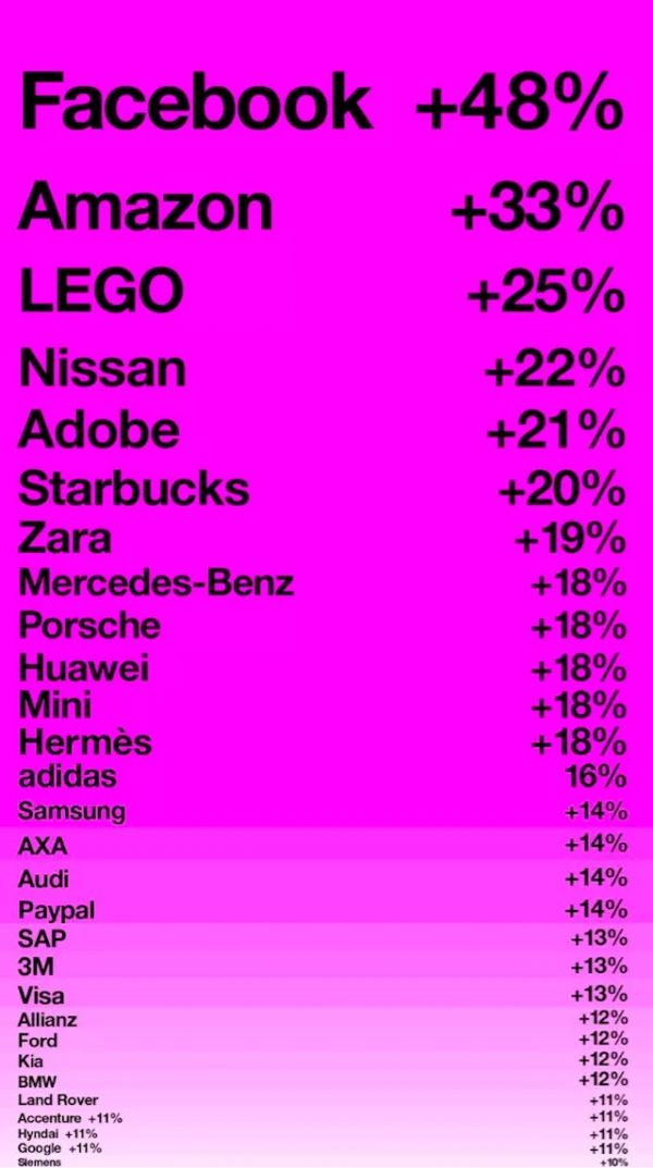 品牌價值增長最快的公司排序,Facebook 和亞馬遜的增幅驚人。